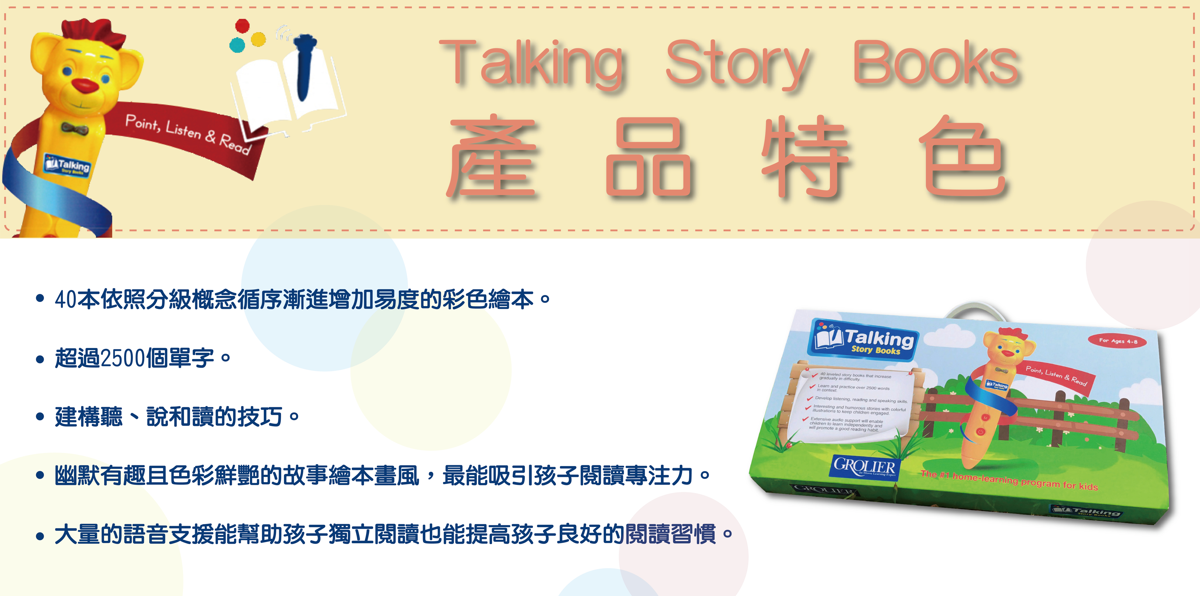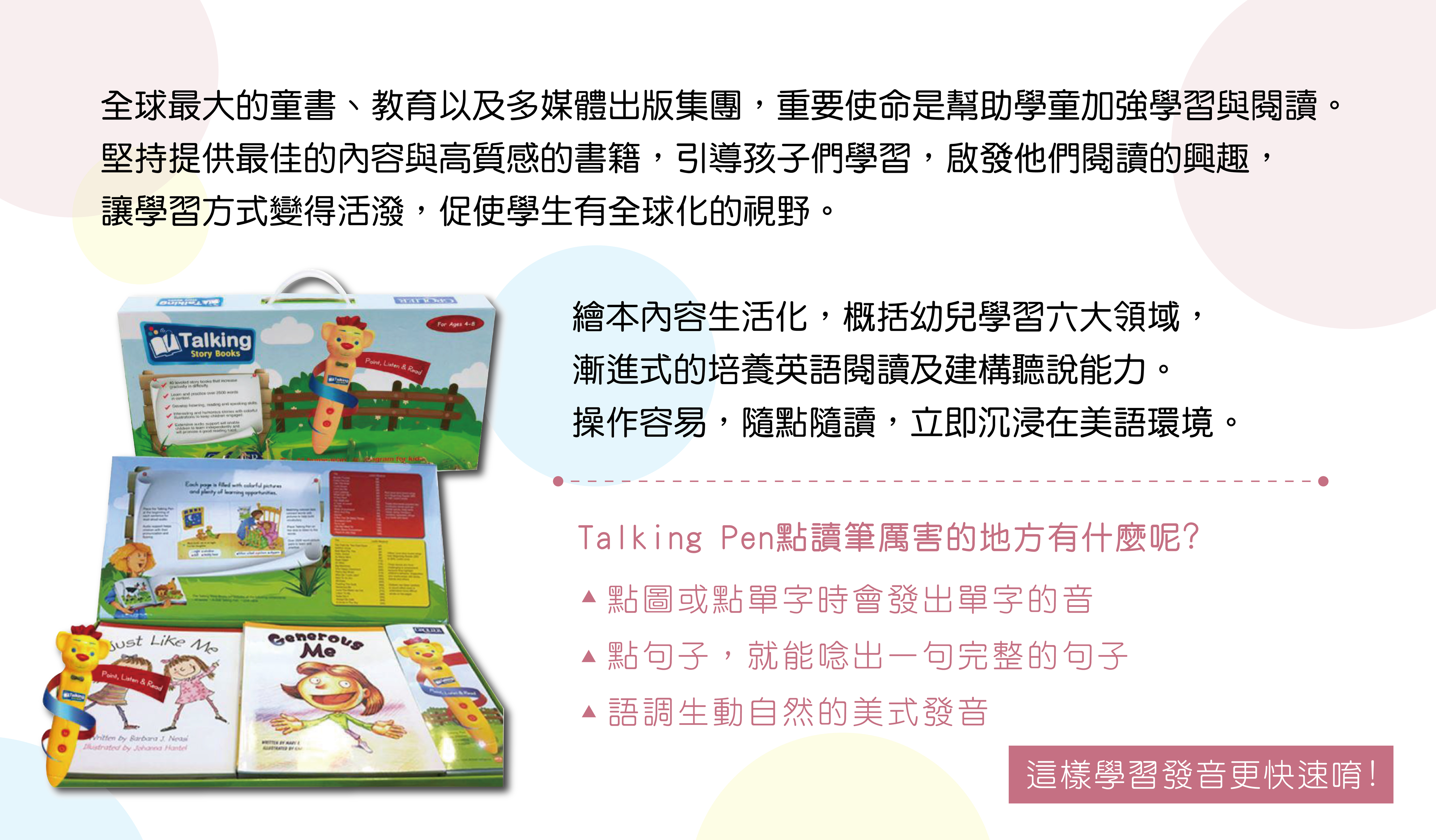 Talking Story Books”絕對是解決家長以上問題的最佳利器!此套書內含『40本主題繪本』 & 『一隻魔法點讀筆』;而40本主題繪本涵蓋了『品格教育』、『生活常規』、『數學概念』、『自然科學』、『藝術美樂』以及『健康教育』等主題,魔法點讀筆不但配合繪本內文提供情境配音,且故事朗讀更是收錄真人美式發音,讓您的孩子在點讀繪本的同時不但訓練手眼協調,也能聽到最正確的發音,彷彿就像道地的美語老師就在你身邊,讓孩子的第二語言學習能有眼到、手到、聽到、讀到,最後必能達到目標!