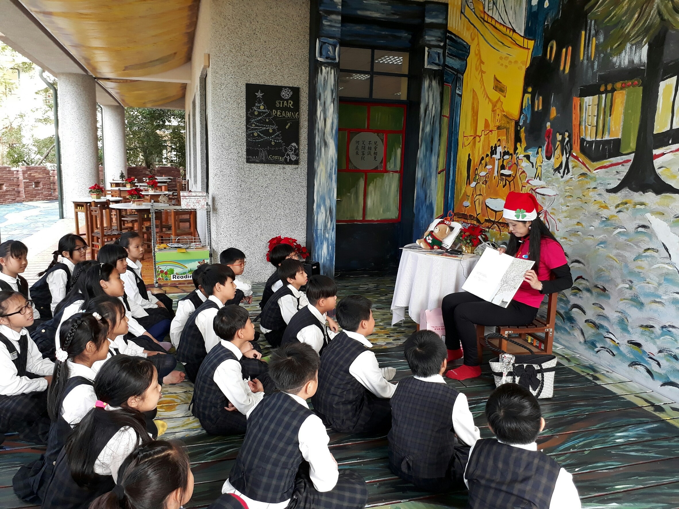 而學校在每年耶誕節期間,更固定有「為愛朗讀」的大活動,為期一至二週,其一,是由各時段值班的圖書志工,為每節來上閱讀課的學生們,閱讀精選過的,充滿愛與關懷的故事,通常是中文為主,而我本身因為英語教學專長的緣故,則自告奮勇地講英文故事,例如:「Owl Babies」、 「Giving Tree」、「How do dinosaurs go to school」、「David」、「Love you forever」等。其二,是由學生在家朗讀故事給家人聽,拍照或畫圖,並寫下書名,便能得到獎勵。閱讀習慣不是本能,需從小培養,而最佳的培養方式,便是陪伴:大人讀書,小孩也讀書;父母親為孩子讀十分鐘睡前故事、孩子也讀給爸媽聽;或選擇良好的朗讀CD,在車上或家裡播放(玩遊戲或吃飯時當背景音樂)等。經由大人朗讀推薦的圖書,很容易在孩子們的心裡留下位置,而日後見到相關的譯本或作者或電影、DVD,更會像遇見老友一樣親切呢!