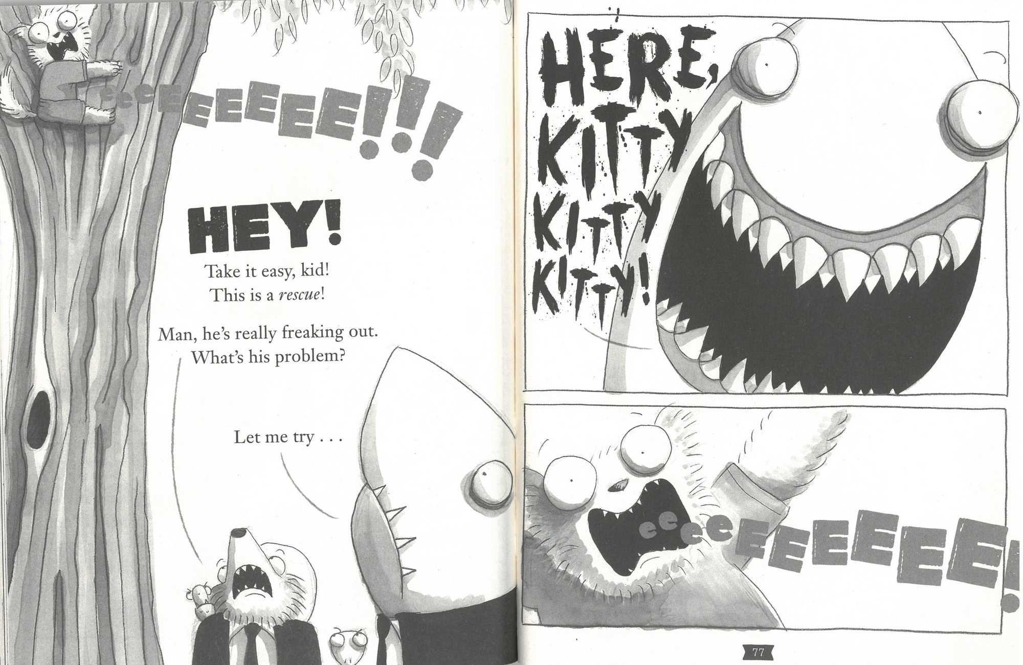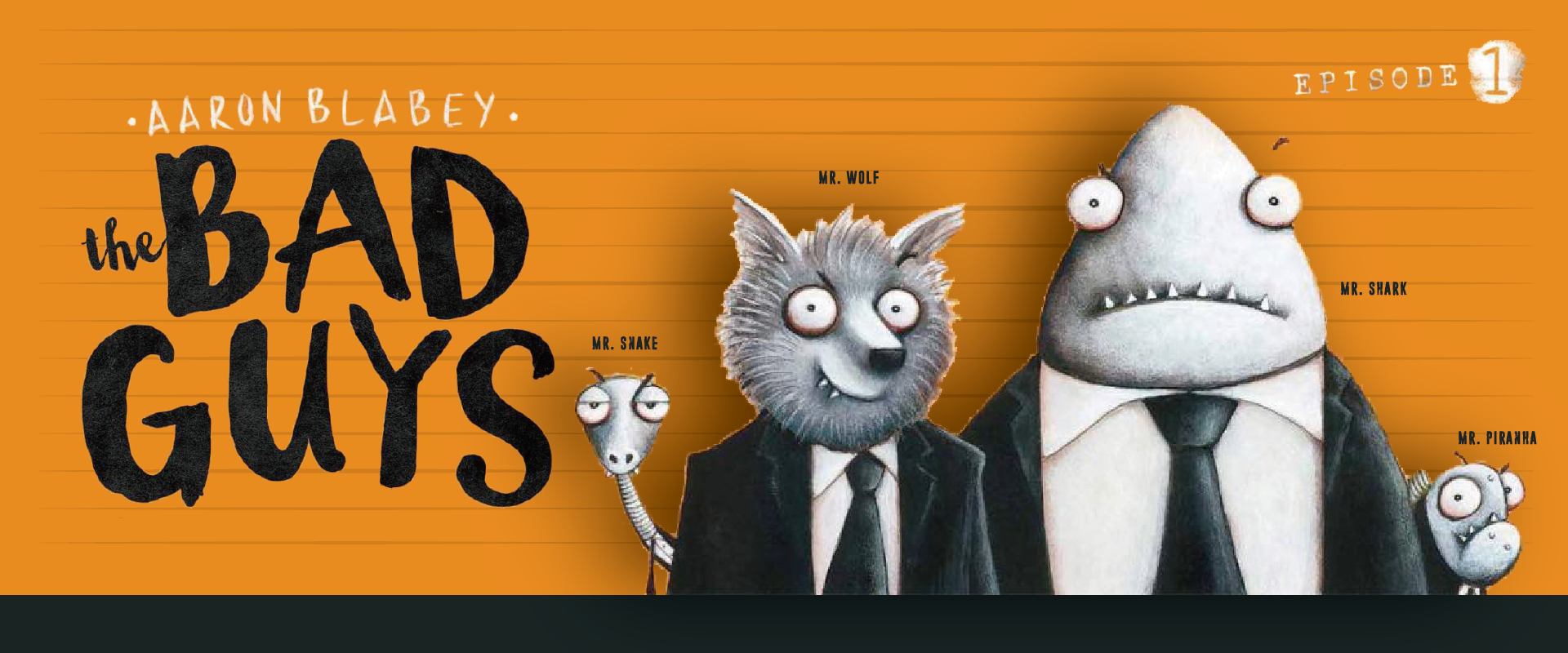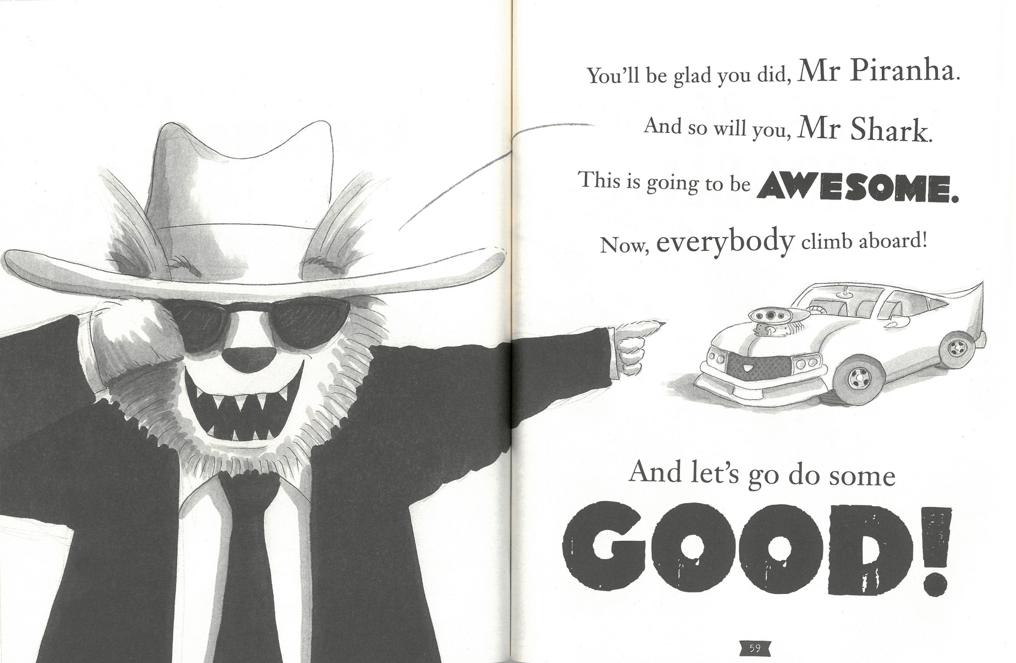 到底the Bad Guys為何會這麼吸引我家小二生呢?我先大略說明一下這書的內容及設計。故事開始是惡名昭彰的大野狼先生想要為自己的名聲做平反,他不認為自己就像大家對他的印象,是個無惡不作的大壞蛋。他決定要組織個行善團隊,專門做好事,為民服務。而他的團員有無所不吞的蛇先生、無肉不歡專吃旅客的食人魚先生和血盆大口啥都能吃的鯊魚先生。在想做好事的大野狼帶頭下,這三位團友只好跟著浩浩蕩蕩的出門找尋獵物-阿-不是啦!是找尋需要協助的對象!故事就這樣一路發展下去~