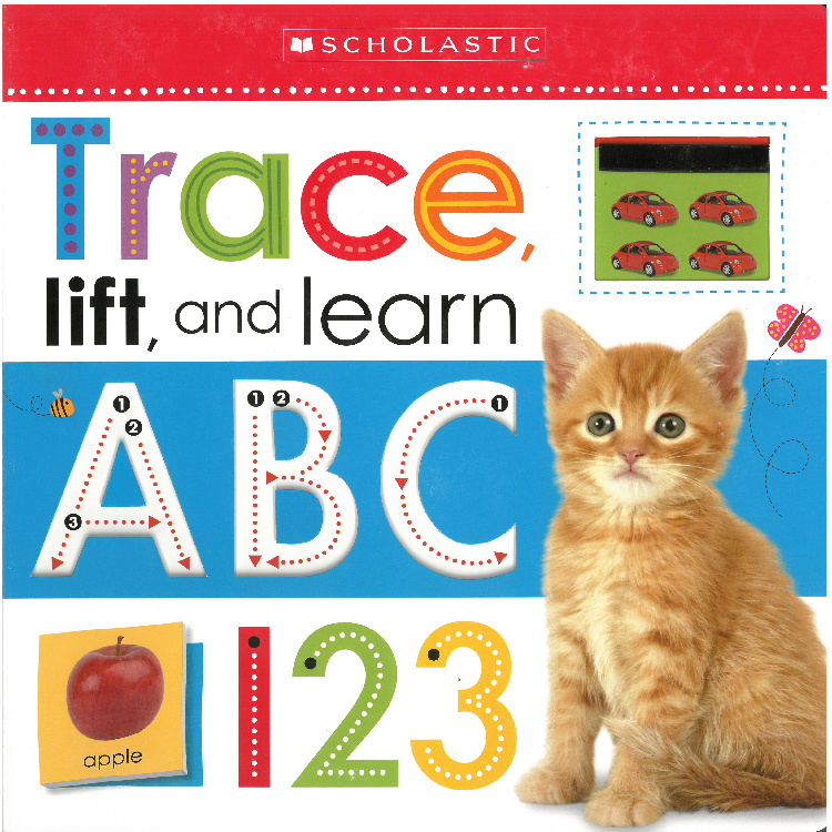 An exciting new series of early learning novelty board books that combine Scholastic's strength in learning with beautiful photography and clear designs to stimulate early learning. "Trace, Play, and Learn ABC 123" is an interactive book full of activities to help children learn their ABCs and 123s. In this action-packed book, children use their fingers to trace letters and numbers, and there are also touches, flaps and sliders to explore and enjoy. Perfect for reinforcing letter and number learning as well as hand-eye coordination. Kids can use their fingers to trace the letters of the alphabet (capital and lowercase) as well as numbers. Each letter or number shape is indented in a lower layer of board (to make it really clear for children to feel the shape), while dots and arrows show the starting points and direction of travel. There is a picture and word for each letter to reinforce letter learning. For the numbers there are sliders that reveal objects to count.